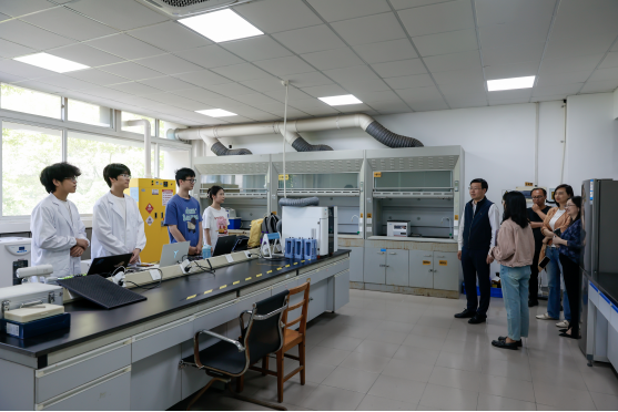 赖明诚一行走访了能源环保新材料工作室、功能食品质量与评价工作室、曹桢技能大师工作室、陈楚技能大师工作室等实验、实训室,并与高层次人才代表围绕我校创新型人才队伍作用发挥、高素养劳动者队伍培养等主题开展座谈交流。