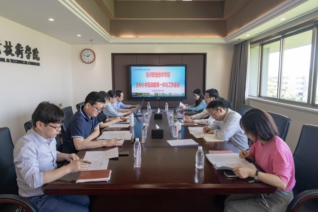 赖明诚强调,要深入学习领会习近平总书记关于学校思政课建设的重要指示精神,贯彻落实党的二十大报告关于推进大中小学思想政治教育一体化建设的总体部署。学校这几年在推进大中小学思政教育一体化建设方面做了一些创新探索,做法和成效得到了上级部门的肯定和认可,下一步要结合杭州特色、职教特质和学校特点做好创新推动。他指出,一是健全机制,统筹推进。以落实立德树人根本任务为目标,各相关职能部门加强同属地中小学联动,协同推进大中小学思政教育一体化工作;二是完善体系,创新探索。进一步量化指标、创新载体,用好长三角高职高专院校思想政治理论课建设联盟、省高职院校党建研究会宣传分会、市属高校思政教育联合体等平台,开展好“大咖话思政”“青春力量”“杭州青年说”等活动,让成效更显著、特色更鲜明;三是目标导向、提炼提升。在前期基础上,聚焦做好“五个一”的探索与创新,打造若干思政金课、金课堂和示范团队,深入推进大中小学思政教育一体化建设。