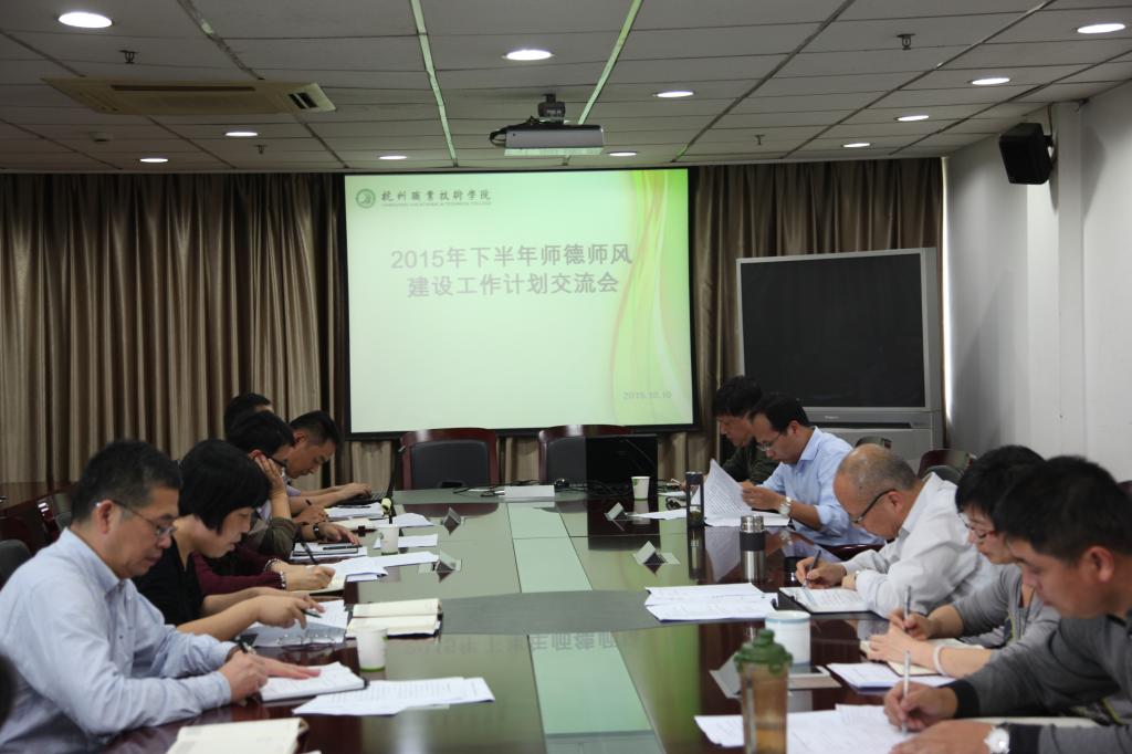 1010日下午,我校2015年下半年师德师风工作计划交流会在第一会议室召开。校党委书记安蓉泉出席会议并讲话,副校长许淑燕主持会议。各二级学院、继续教育学院、人文社科部、图书信息中心、资产经营管理有限公司以及职能部门主要负责人参加会议。