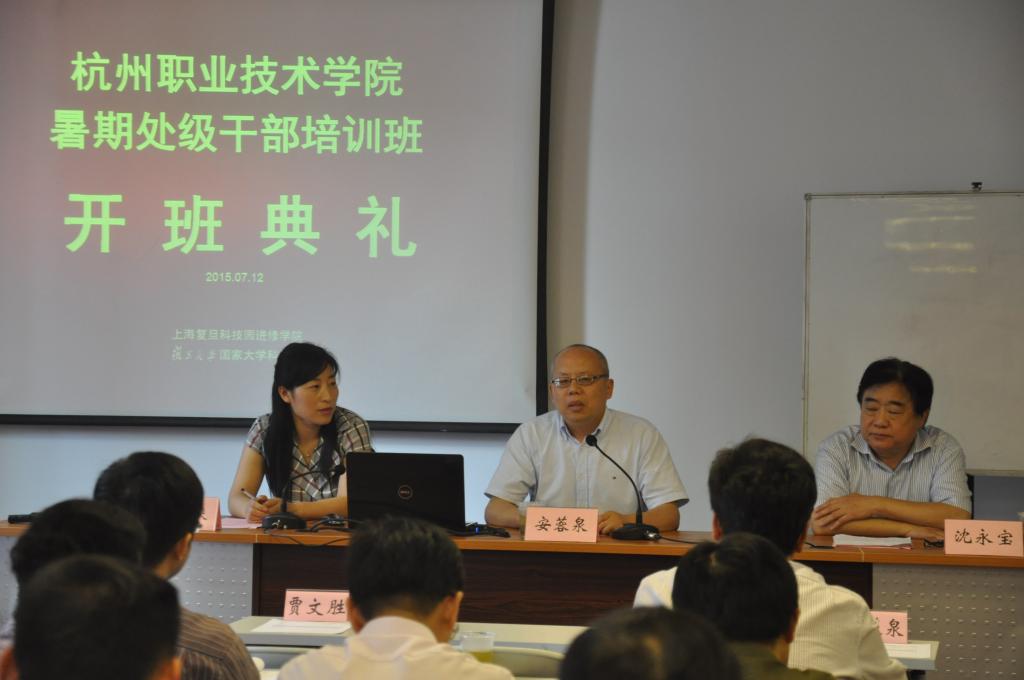 在开班典礼上,复旦大学科技园进修学院院长沈永宝向各位学员介绍了复旦大学的发展概况和科技园进修学院的主要办学特色。安蓉泉书记在讲话中指出本次赴上海学习是我校加强干部队伍能力素质建设的重要举措,希望各位学员珍惜机会,认真学习先进的知识理念,结合实际工作充分思考、推进工作,为学校下一步做好十三五规划,圆满完成骨干校验收等重要工作做好知识储备和思考铺垫。
