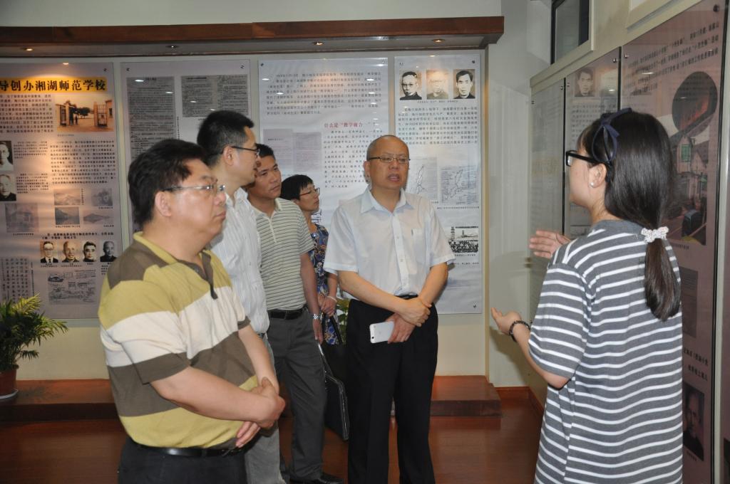 校党政领导班子在傅勤、谢列卫的陪同下实地参观了杭科院的教育学院、城市建设学院实训基地、艺术学院毕业生作品展、陶行知研究馆等。