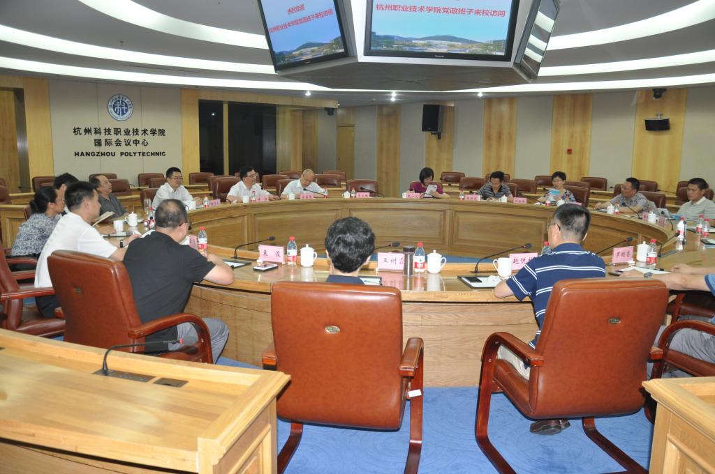 6月15日下午,校党委书记安蓉泉、校长贾文胜率全体领导班子成员前往杭州科技职业技术学院调研交流。杭州科技职业技术学院党委书记傅勤、校长谢列卫及领导班子全体成员参加接待。党政办负责人随行考察。