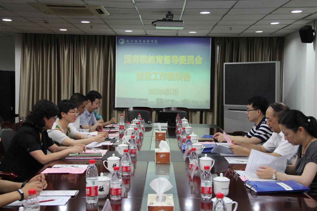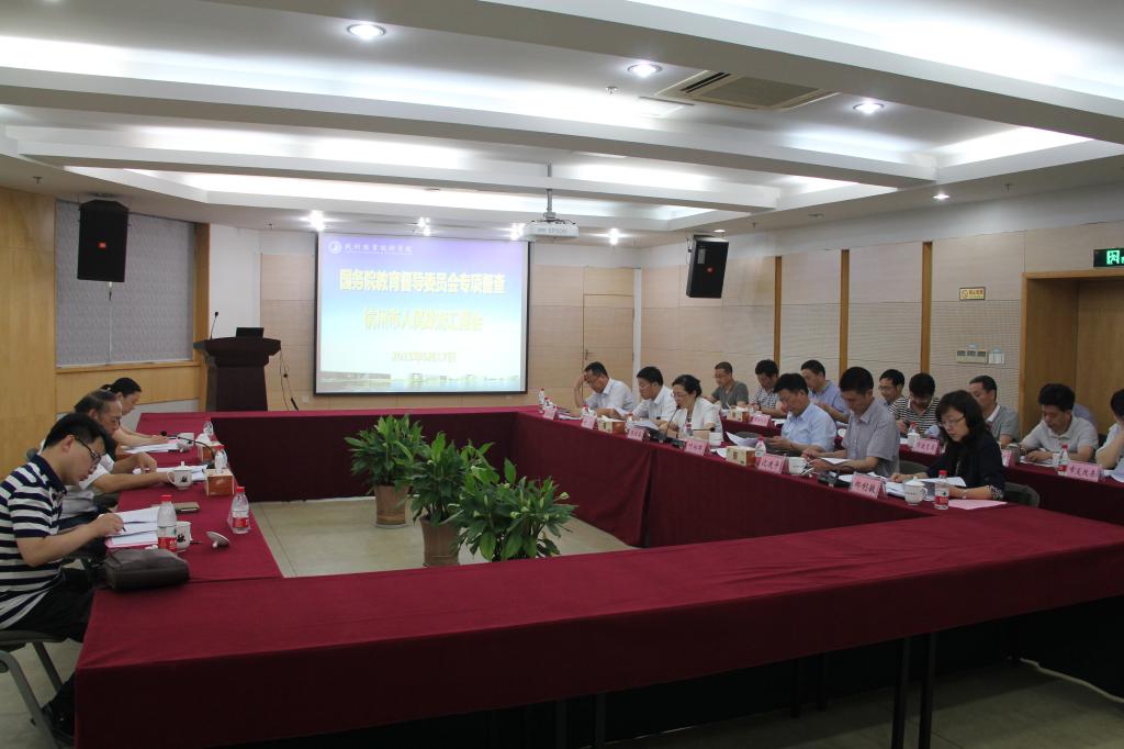 杭州市副市长陈红英,副秘书长姚坚,市教育局局长沈建平,副局长郑利敏,以及市发改委、市教育局、市人社局、市财政局、市经信委、市科委相关部门分管领导在我校第一会议室进行专题汇报。陈红英介绍了杭州市的职业教育体系建设情况、行业企业参与情况、质量提高与政策保障情况,指出了存在的主要问题和建议,并回答了督查组专家的质询。