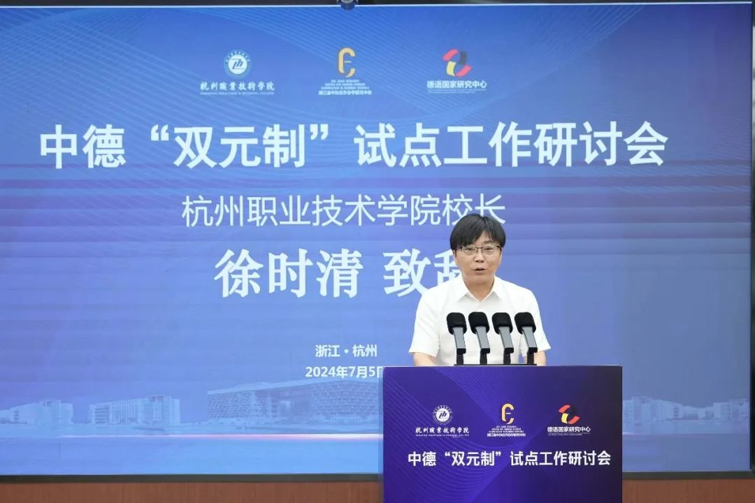 7月5日,浙江省中德“双元制”试点工作研讨会在我校成功举办。浙江省教育厅副厅长舒培冬、我校校长徐时清出席会议并致辞。本次活动由浙江省教育厅主办,杭州职业技术学院和浙江省中外合作办学研究中心共同承办,浙江科技大学德语国家研究中心协办。来自全省13所“双元制”试点院校的分管校领导、国际处负责人、“双元制”工作具体负责人等50余人参加研讨会。省教育厅国际合作与交流处处长蓝晶晶主持会议。