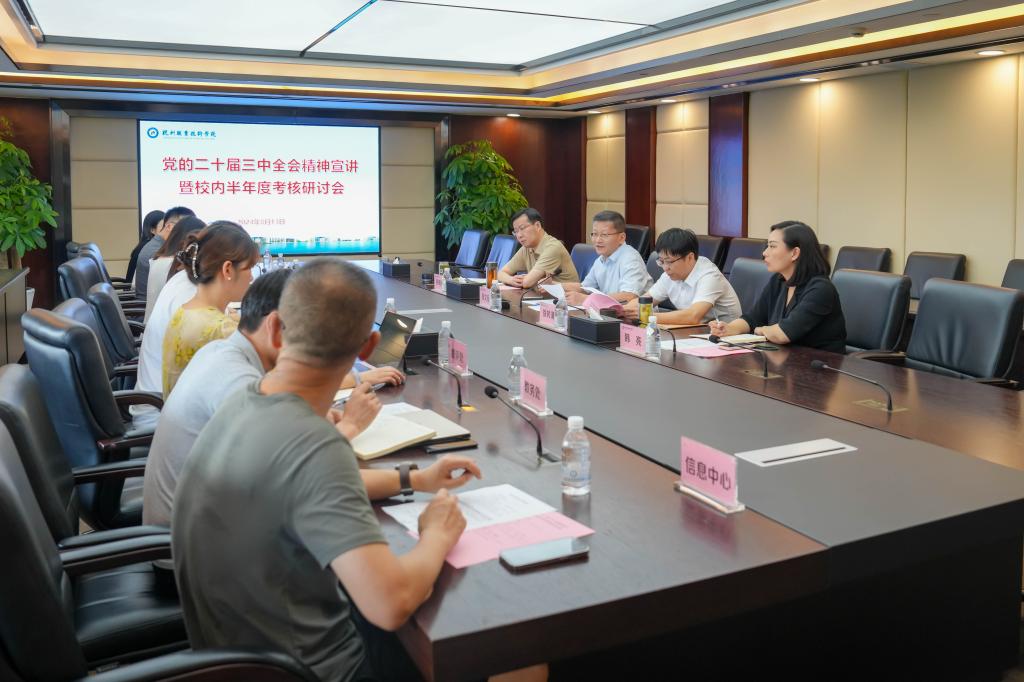 8月13日下午,党的二十届三中全会精神宣讲暨校内半年度考核研讨会在行政楼528会议室举行。校党委书记陈文岳,校长徐时清,党委副书记赖明诚,党委委员、组织部长韩亮,及相关职能部门负责人参加会议。赖明诚主持会议。