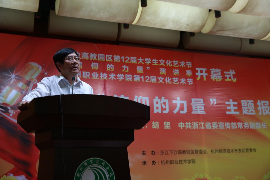 开幕式在省委宣传部、省委教育工委、团省委联合主办的“信仰的力量”演讲季的第一场专题报告会中拉开帷幕。胡坚与下沙高教园区14所高校的广大师生共同探讨“信仰的力量”。演讲中,他围绕“信仰是人生路上的一盏明灯;信仰对人生具有重大影响,充满无穷的力量;怎么认识当前在信仰中存在的问题?怎样培养正确的信仰?”这四个问题进行探讨,告诉大学生信仰的本质是要懂得感恩和敬畏,要有远见和胸怀,要做一个有自立、有情义、有道德的人。胡坚用富有哲理的寓言、发人深省的故事、鲜活生动的案例,深入浅出地诠释了信仰的真谛,信仰的力量。