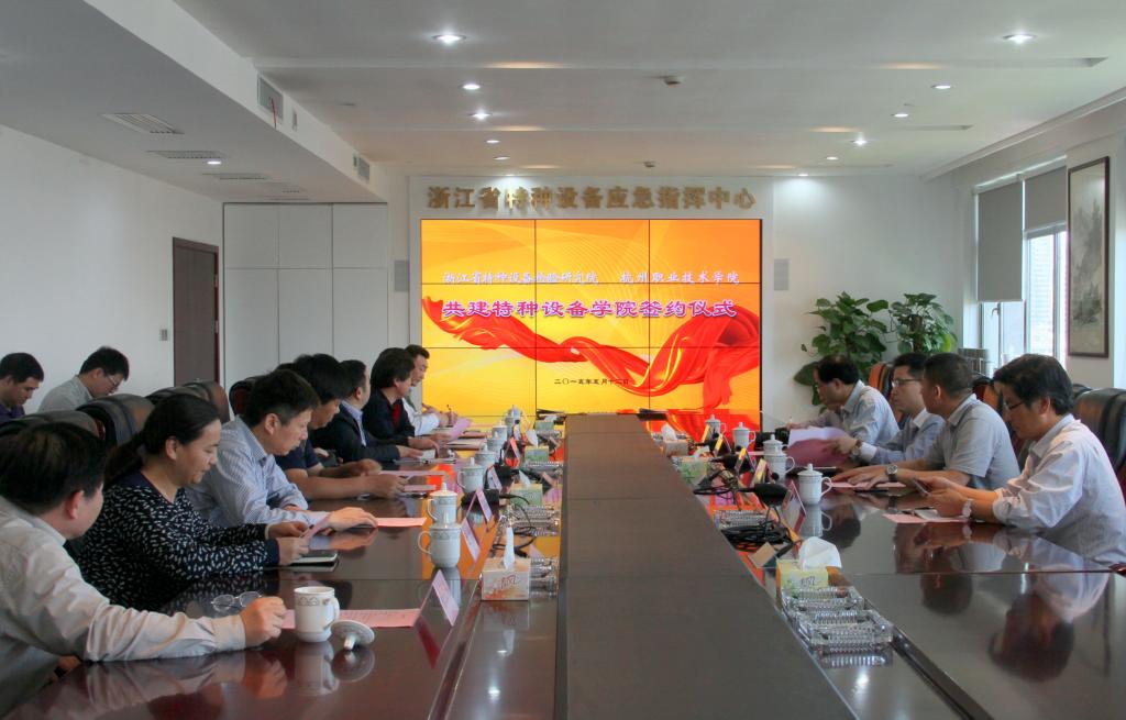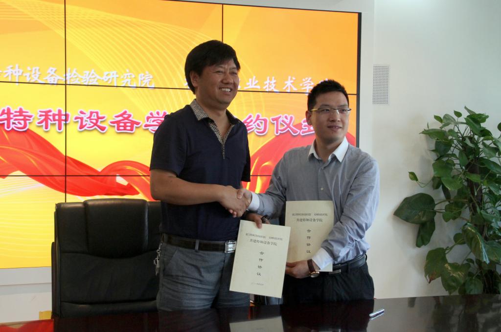 5月12日上午,我校与浙江省特种设备检验研究院合作共建特种设备学院签约仪式顺利举行。省质监局副局长赵海滨、特种设备监察处处长李丰庆,省特检院院长钟海见、党委书记王祥岗等班子成员,我校校长贾文胜、副校长陈加明及双方相关职能部门负责人出席了签约仪式。