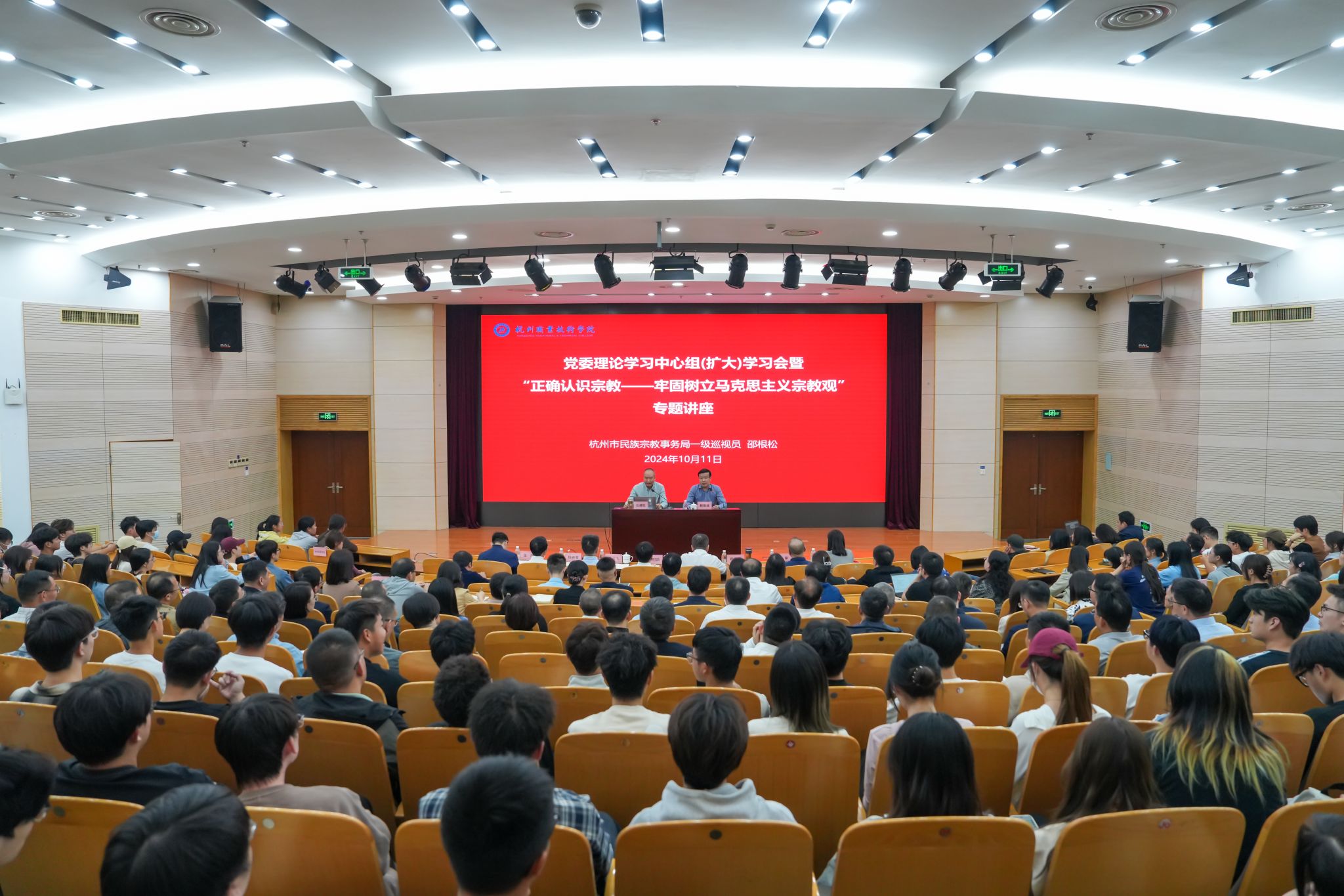 10月11日下午,我校10月党委理论学习中心组(扩大)学习会暨“正确认识宗教——牢固树立马克思主义宗教观”专题讲座在行政楼报告厅举行。本次学习会特邀杭州市民族宗教事务局一级巡视员邵根松来校开展专题报告。党委书记陈文岳、校长徐时清等学校领导班子成员,全体中层干部、二级学院师生代表、学生社团负责人等400余人共同参加学习。本次学习会由党委副书记赖明诚主持。