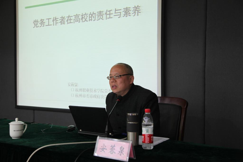 下午培训由安蓉泉作题为《党务工作者在高校的责任与素养》的专题讲座。他通过生动的案例,点出基层党组织应具备的“思想引导、组织干预、纪律约束、作风示范”四方面重要责任,结合自身多年工作经历,与学员们谈了党务工作者应具备的几方面素养:一是定位意识,认清党建工作的目的是服务教学、服务学生、服务中心工作;二是服务意识,只有努力做好服务才能凝聚人心,推动工作;三是方法意识,希望大家多动脑子,围绕党建工作“引领性、服务性”,从支部、部门实际出发创新性的开展党建活动;四是业务素养,党务干部要不断结合工作及时补充缺少的素养,真正掌握情况和问题才能避免“隔靴搔痒”;五是党建素养,要具备把党建理论知识和党建工作实际结合的能力;六是综合素养,包括思想素养、理论素养、文字素养、传播素养等等。最后他谈了党务干部应如何培养自身素养,希望各位学员通过“艰苦学习、躬身实践、勤于思考、完善思维、开阔胸怀”五个方面的努力提升自己素养,从而在自己岗位上做出成绩,为杭职院党建工作的科学化发展做出贡献。