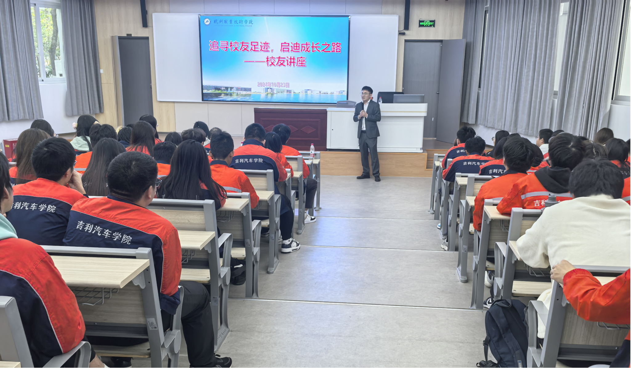 10月23日下午,我校2013级吉利汽车学院优秀校友、杭州骏宝行MINI用户运营经理及BMW BDC主管朱键鹏返校,开展题为《精益求精,驶向未来》的精彩讲座,150余名师生代表参加,学工部、吉利汽车学院相关负责人参加讲座。