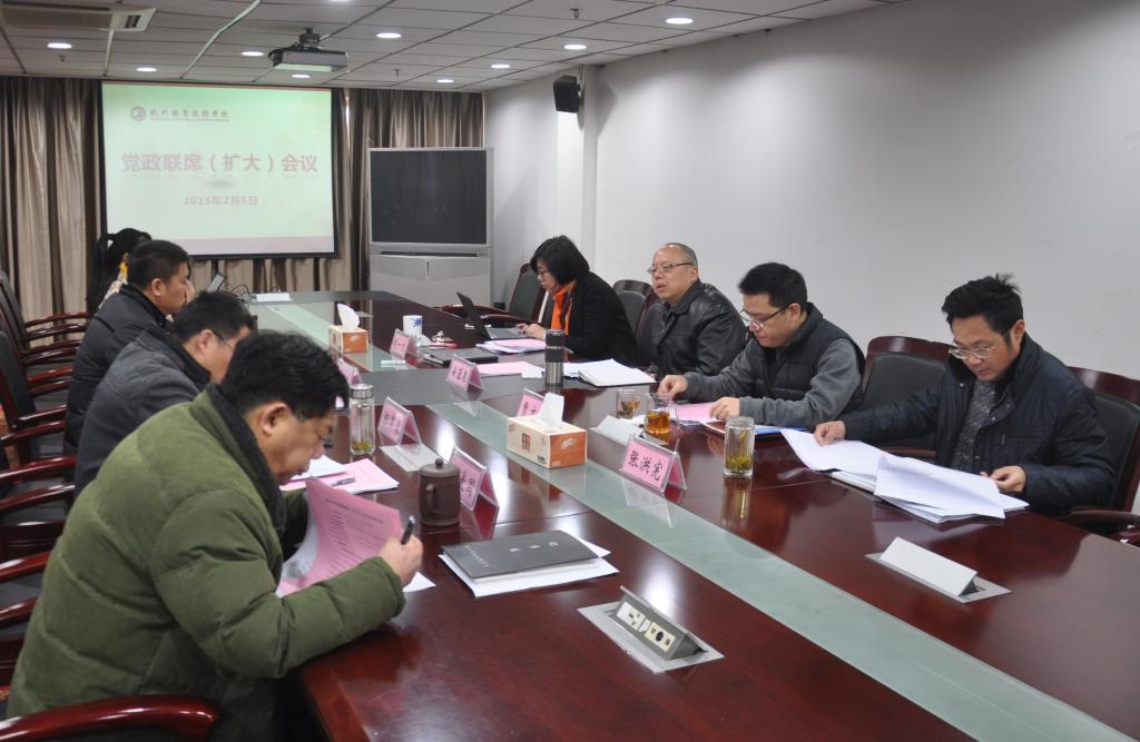 2月5日,学校在行政楼第一会议室召开党政联席(扩大)会议,专题研讨了学校管理改革的有关问题和2015年重点工作。党委书记安蓉泉,校长贾文胜,党委副书记赵一文,副校长张洪宪,纪委书记陈泉淼,副校长陈加明,党委委员孙爱国、金徐伟,党政办、人事处、学工部、资产经营公司、继教院、人文社科部等部门负责人参加会议。