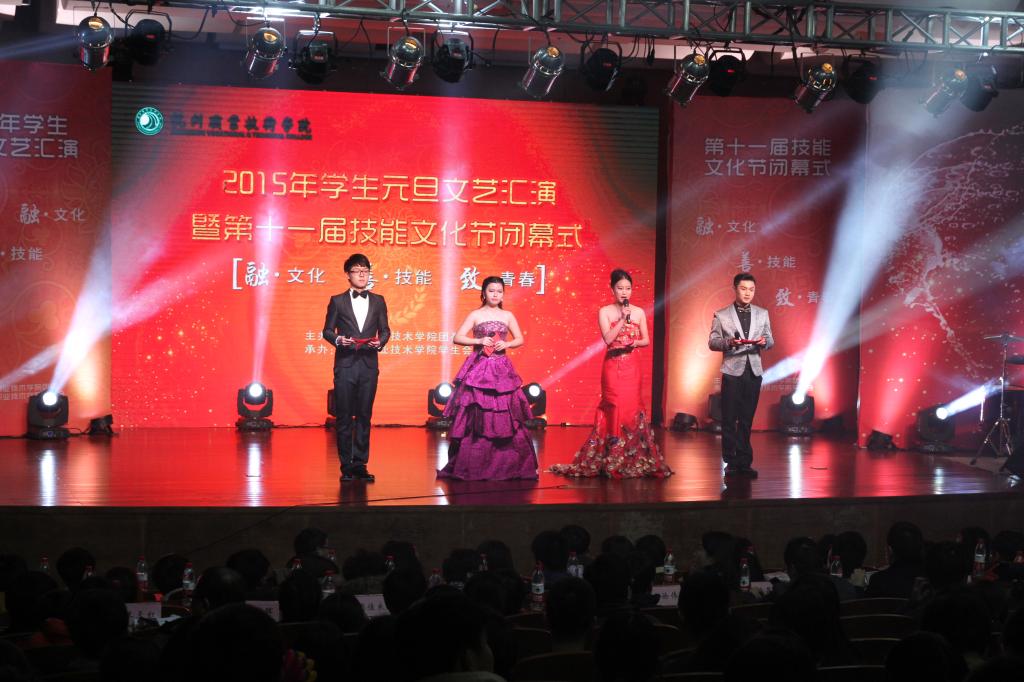 12月24日18点,我校2015年学生元旦文艺汇演暨第十一届技能文化节闭幕式在图书馆一楼报告厅隆重举行。党委书记安蓉泉、校长贾文胜、副校长许淑燕、纪委书记陈泉淼、副校长陈加明、党委委员金徐伟出席本次晚会。此外,第十一届技能文化节组委会成员、外校嘉宾及部分在校师生也一起观赏了晚会。