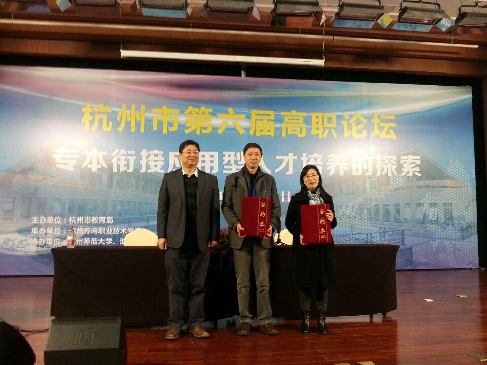 会议还举行了我校与杭师大钱江学院的专本衔接签约仪式。许淑燕代表我校与杭师大钱江学院副院长刘喜文签订战略合作协议。两校将依托杭职院职业教育特色和校企合作资源,发挥钱江学院办学资源和专业基础优势,在共建专业建设指导委员会、共同开展课程建设、共享实训(实习)平台、互聘师资、共享合作企业资源和共同提升社会服务能力等方面开展深入合作。