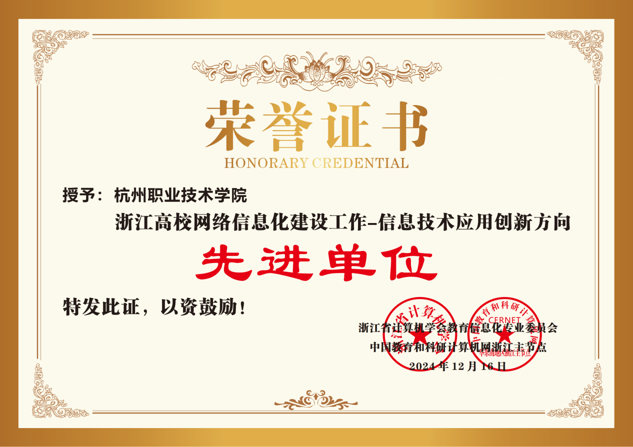 日前,由浙江省计算机学会、中国教育和科研计算机网浙江省主节点组织的2024年度浙江省高校网络信息化建设工作先进评审揭晓。我校荣获浙江省高校网络信息化建设工作信息技术应用创新方向先进单位,信息中心陈俊君老师荣获先进个人。
