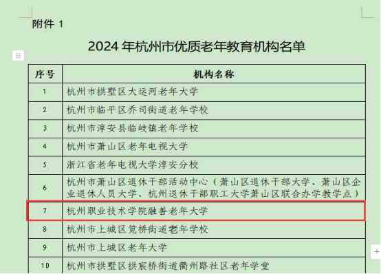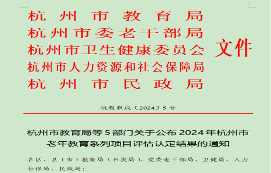 12月《杭州市教育局等5部门关于公布2024年杭州市老年教育系列项目评估认定结果的通知》(杭教职成〔2024〕5号)发布,经教育行政部门自主择优推荐申报、评审组材料评审、专家组实地核查、五部门联合复核评定,杭州职业技术学院融善老年大学作为全市唯一一所由高校举办的老年教育机构,获评杭州市优质老年教育机构。