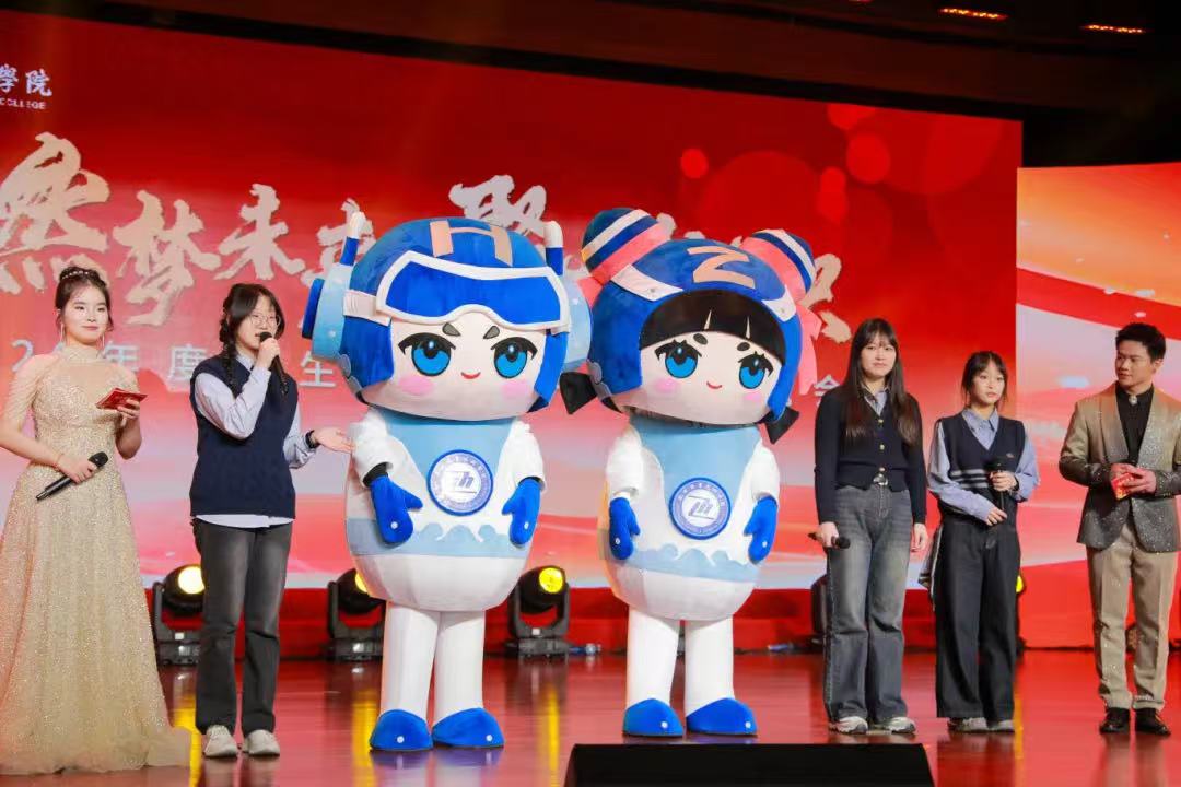 学工IP形象“融融”“善善”在活动中正式亮相,将气氛推向了高潮。“融融”“善善”的设计者代表杭州动漫游戏学院的王泽华、王乙涵、王雅文介绍了创作理念。杭职学工IP形象设计以“执着专注、精益求精、一丝不苟、追求卓越”的工匠精神为主导,融合现代科技感,将机器人的形象与工匠元素巧妙结合,创造出一个既富有科技感又不失文化底蕴的可爱卡通形象,既生动展现了杭职学工的活力、创造力和团队协作精神,又充分展示出数智杭职的独特魅力与人文关怀。