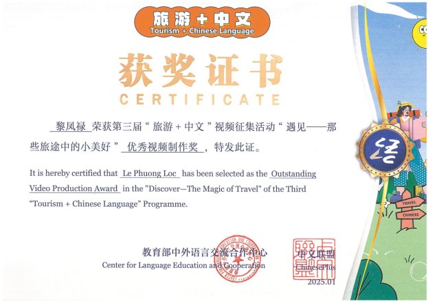 日前,由教育部中外语言交流合作中心主办的“遇见——那些旅途中的小美好”第三届“旅游+中文”视频征集活动落下帷幕。我校越南籍学生黎凤禄创作的短片《中国一瞥:每个角落的美丽》在来自62个国家参赛者的近400条视频中收到近3000次网络点赞,荣获“优秀视频制作奖”,其指导老师刘博获“优秀指导教师奖”,杭州职业技术学院获“优秀活动参与单位奖”。此为我校留学生在教育部语合中心所办活动中首次获奖。