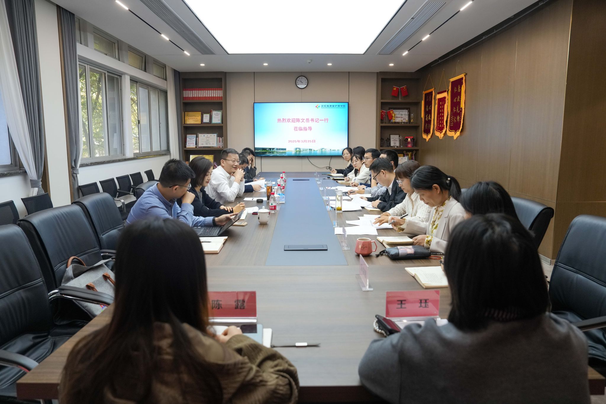 3月25日上午,校党委书记陈文岳带队赴彩虹鱼康复护理学院开展专题调研,副校长程利群,办公室、组织部相关负责人陪同调研。彩虹鱼康复护理学院领导班子、职能部门负责人及教师代表参加调研座谈。