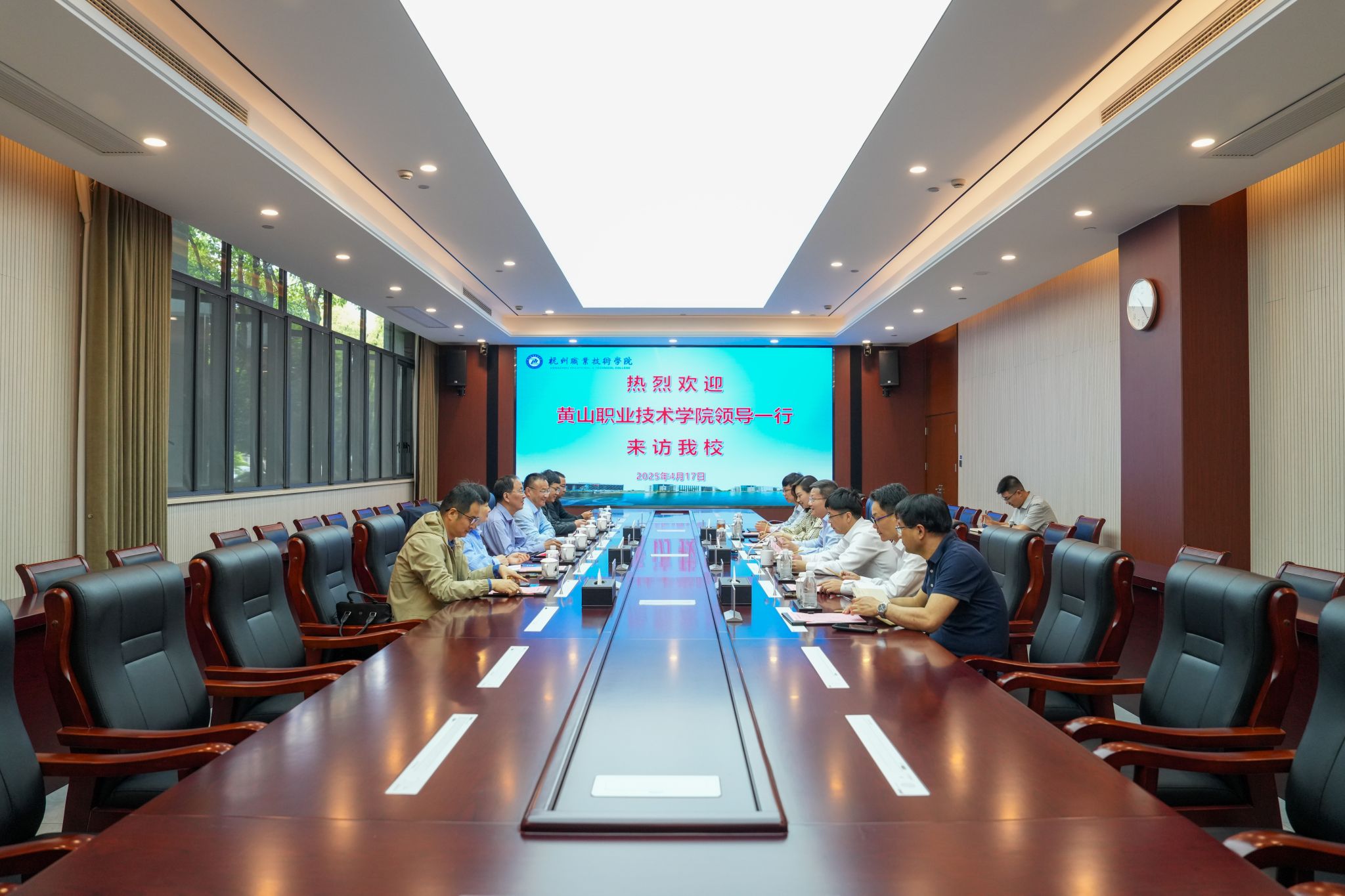 4月17日上午,黄山职业技术学院党委书记陈立青一行来访我校,校党委书记陈文岳、校长徐时清、党委委员、组织部长韩亮,办公室、教务处、商贸旅游学院等相关部门负责人参与接待。