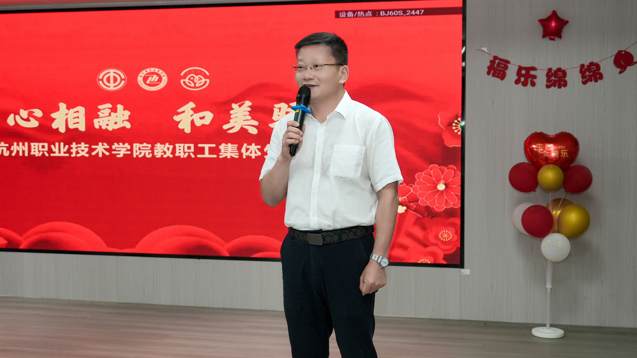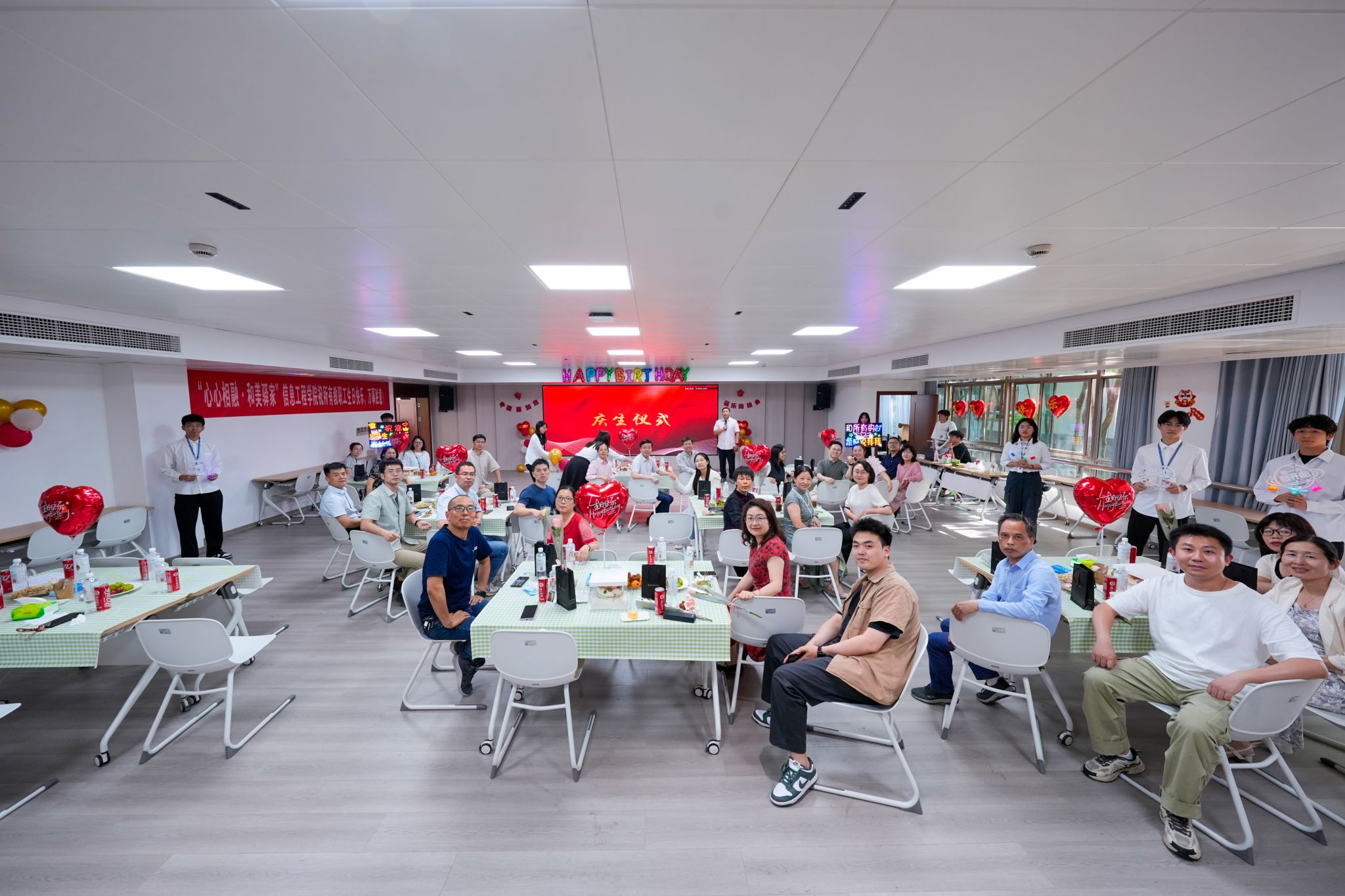 五月杭城夏意萌,草木葱茏映校园。5月14日下午,由校工会主办、信息工程学院分工会承办的“心心相融・和美驿家”五月教职工集体生日会在校学生活动中心温情启幕。校党委书记陈文岳,党委副书记、工会主席赖明诚与58名寿星欢聚,共享美好时光。
