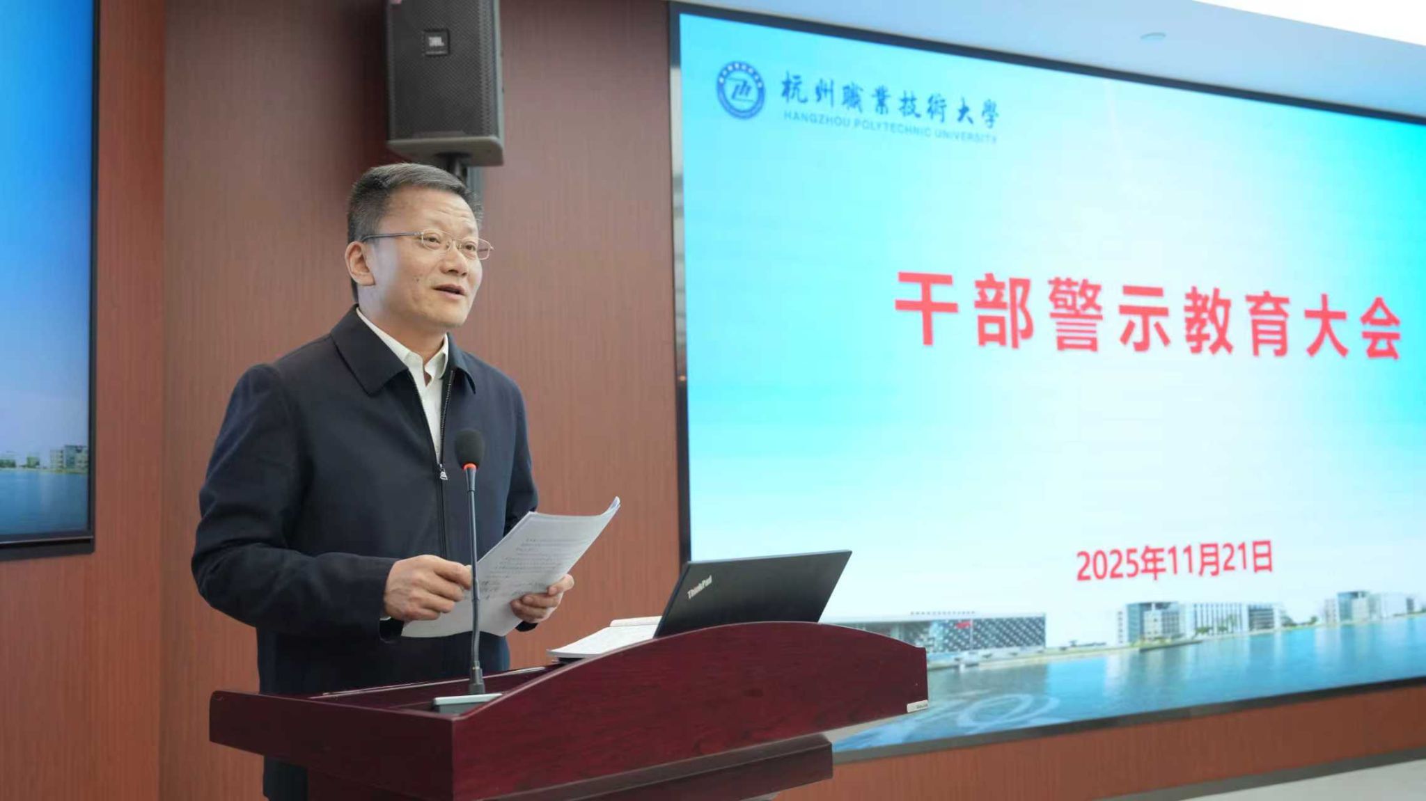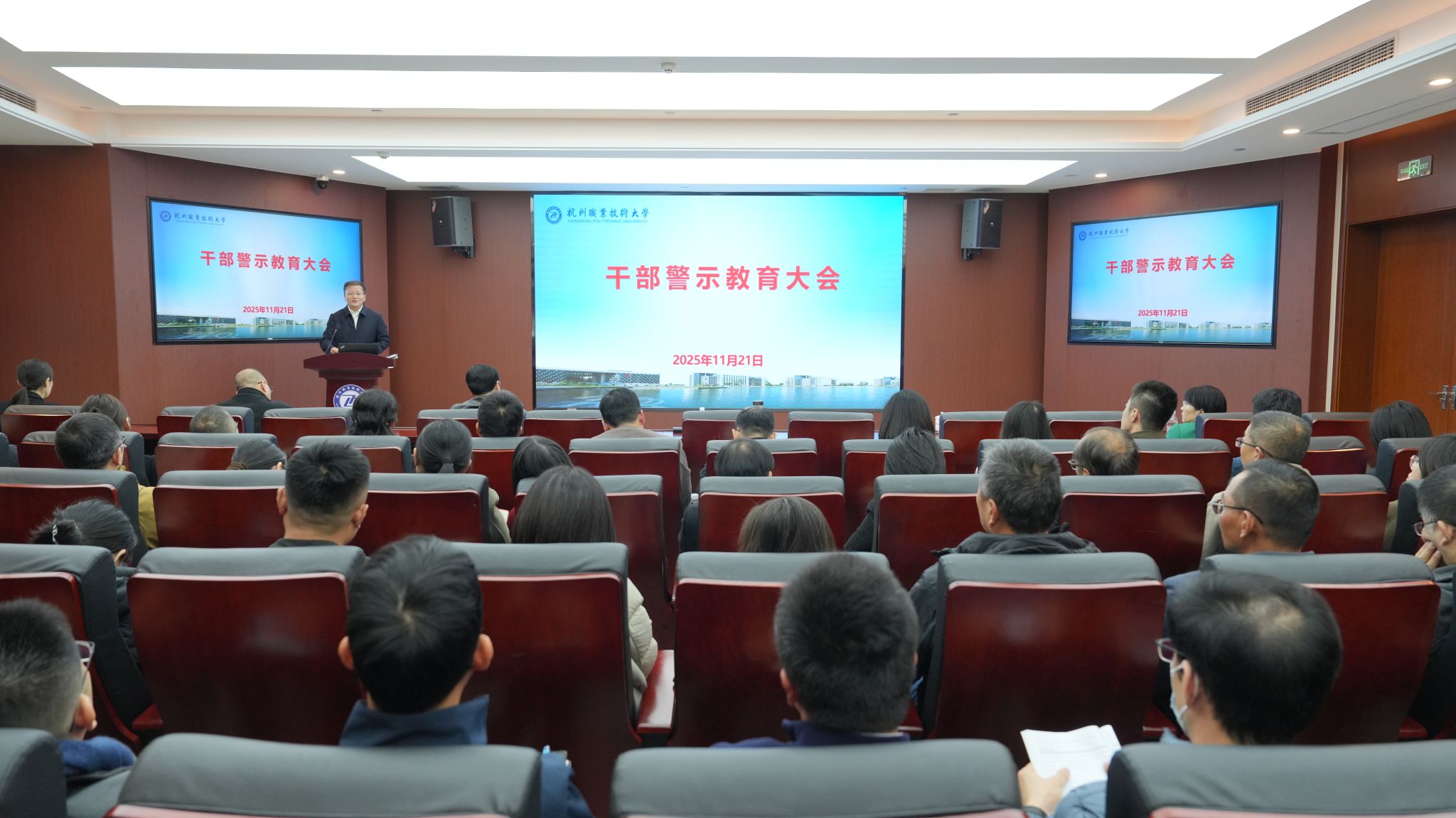 11月21日下午,杭州职业技术大学在行政楼117会议室召开全校干部警示教育大会。校领导班子成员、全体中层干部参加会议。会议由校纪委书记沈阳红主持。