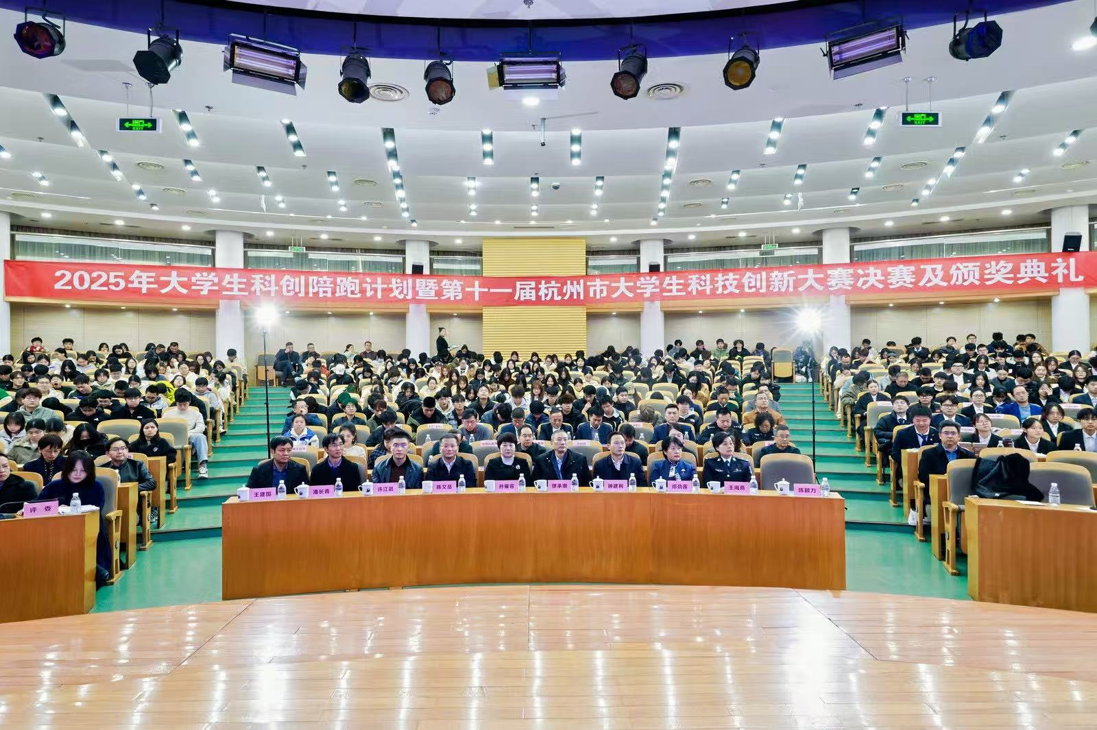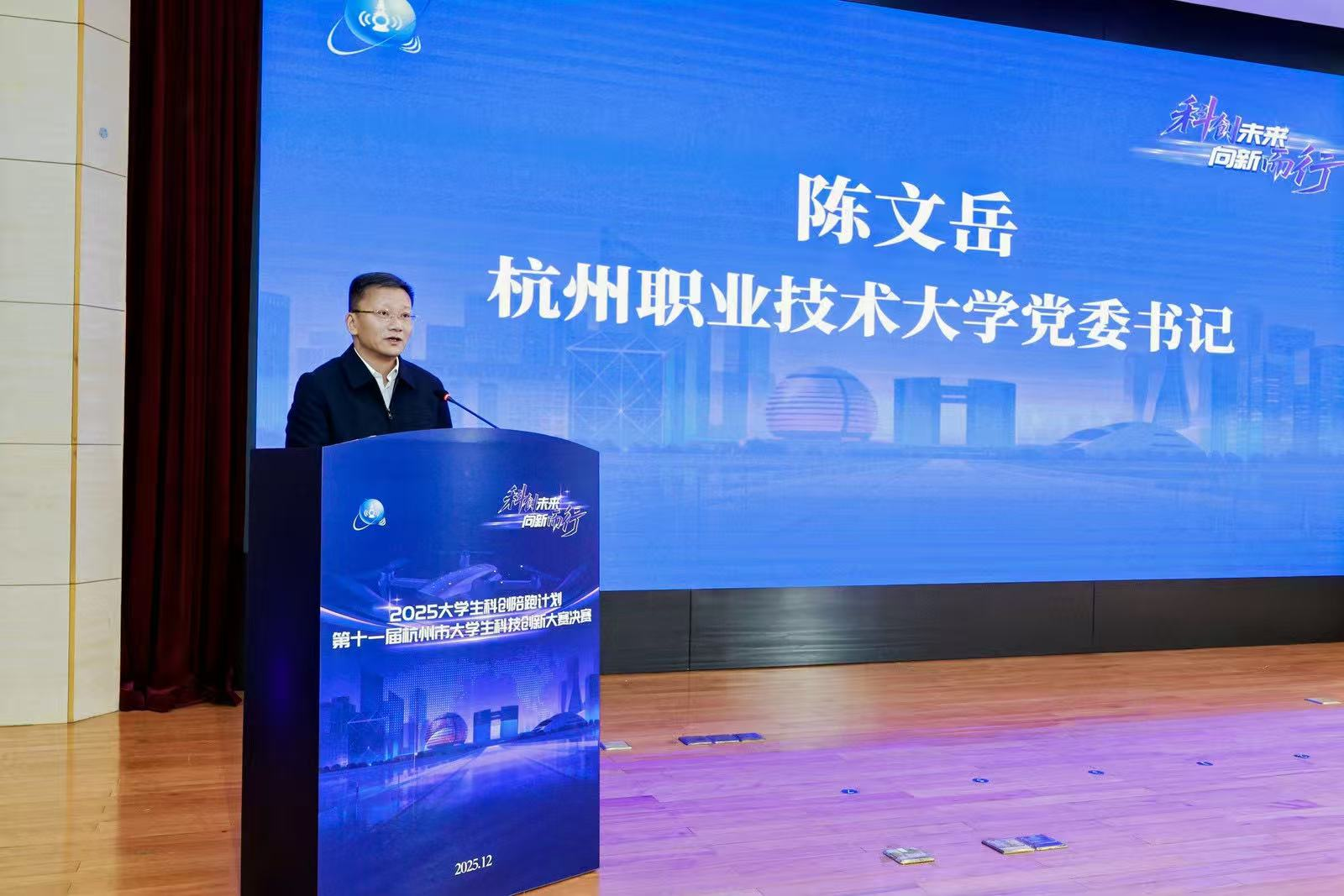 12月5日,2025杭州市大学生科创陪跑计划暨第十一届杭州市大学生科技创新大赛决赛及颁奖典礼在我校举行。世界城地组织亚太区“一带一路”地方合作委员会副主席、原杭州市副市长缪承潮,主办方杭州市科协党组书记、主席孙雍容,钱塘新区党工委副书记、钱塘区委副书记、社工部部长、政法委书记钟建利,杭州职业技术大学党委书记陈文岳出席活动。杭州职业技术大学副校长邓劲莲、共青团杭州市委副书记许江晨、杭州市公安局刑侦支队党委委员、政治部主任王海燕、杭州市教育局高等教育处处长潘长青、杭州市科协学会部部长王建国、浙江省科技传播协会会长、杭州市科协常委陈颖力,市教育局、市科技局、市市场监督管理局、市人力资源和社会保障局、团市委等部门领导,各区县科协负责人、各高校团委、创业学院负责人,金融机构、科技企业、风投机构代表,浙江广播电视集团、杭州电视台、杭州日报媒体代表参加。