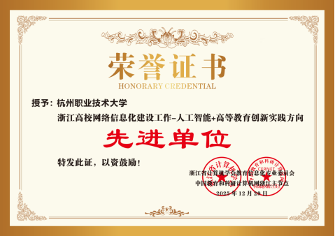 近日,浙江省计算机学会教育信息化专业委员会、中国教育和科研计算机网浙江主节点联合公布了2025年浙江高校网络信息化建设相关奖项评选结果,我校荣获浙江省高校网络信息化建设工作“人工智能+高能教育创新实践方向”先进单位。
