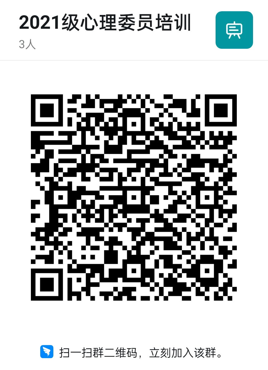 为能把本系列讲座培训覆盖到校心理健康协会和分院心理健康协会全体成员,本次培训将采取线上线下相结合的方式组织进行,全体新生心理委员要求参与线下培训,心理健康协会成员通过钉钉群进行线上培训(二维码见下图)。