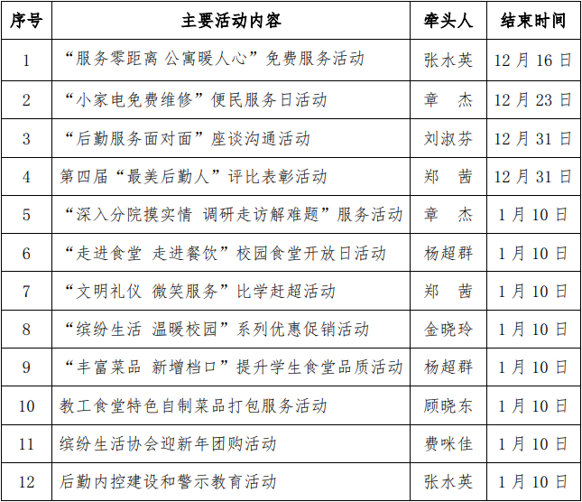 1.服务提升。要深入扎实地开展服务师生活动,各项目业务主管牵头,分别开展食堂品质提升、公寓贴心服务、维修与保洁规范服务、商贸优惠服务等活动,坚持把师生对美好生活的向往作为工作的落脚点,积极创造条件为师生提供便利。