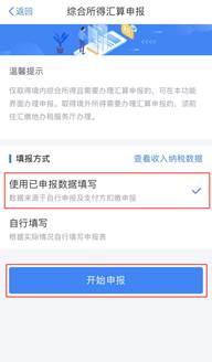 (1)点击首页“综合所得年度汇算”,填报方式选择“使用已申报数据填写”(推荐选择),点击“开始申报”,出现标准申报须知点击“我已阅读并知晓”。