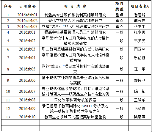 2016年杭州职业技术学院校级招标科研课题共申报21项,经校内外专家匿名和回避评审、学校学术委员会委员审定,评审重点课题3项,一般课题10项,现将立项结果公布如下: