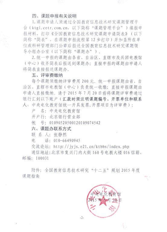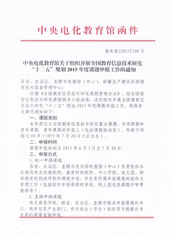 现将《中央电化教育馆关于组织开展全国教育信息技术研究“十二五”规划2015年度课题申报工作的通知》(教电馆[2015]100号)转发给你们,并就相关事宜通知如下: