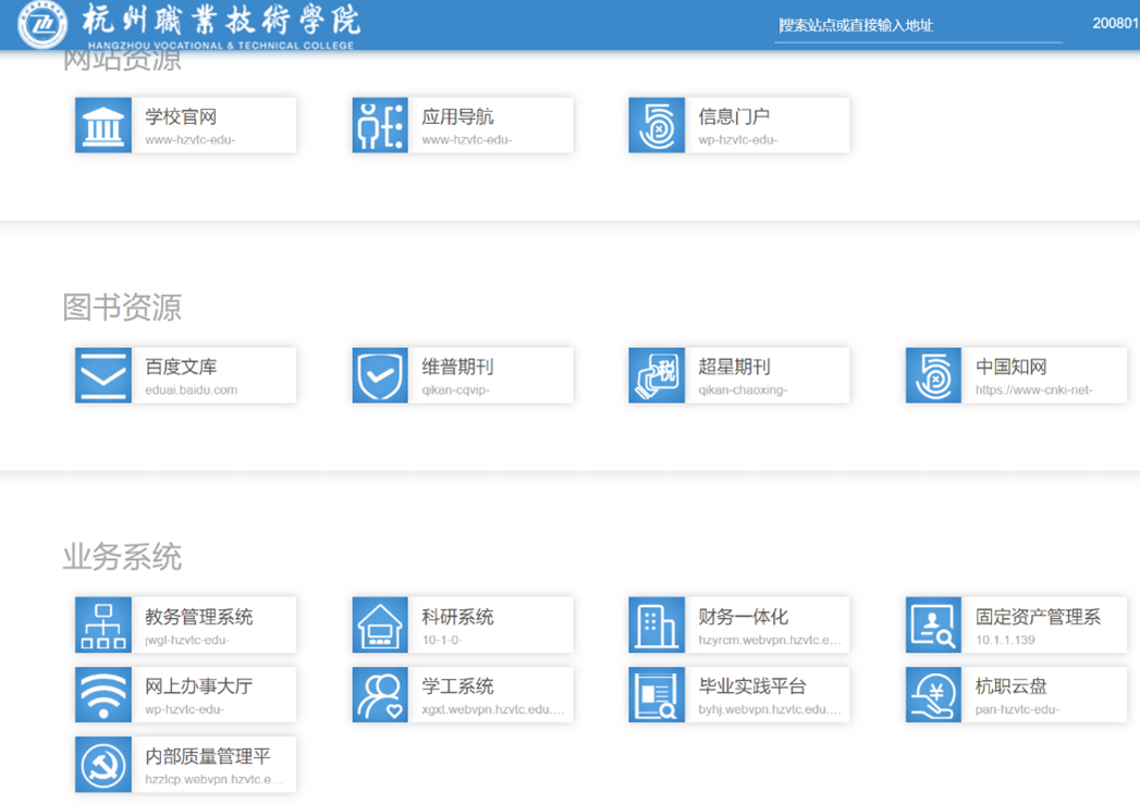 WebVPN提供基于web的内网应用访问控制,无需再安装VPN客户端,即可允许授权用户访问只对内网开放的web应用,实现VPN的功能。广大师生在校外可从学校官网首页右上角“webvpn”进入(如下图1所示),或使用浏览器直接访问https://webvpn.hzvtc.edu.cn ,登录的账户和密码即为本人统一身份认证的账户和密码,进入后即可访问内网资源(如下图2所示)。