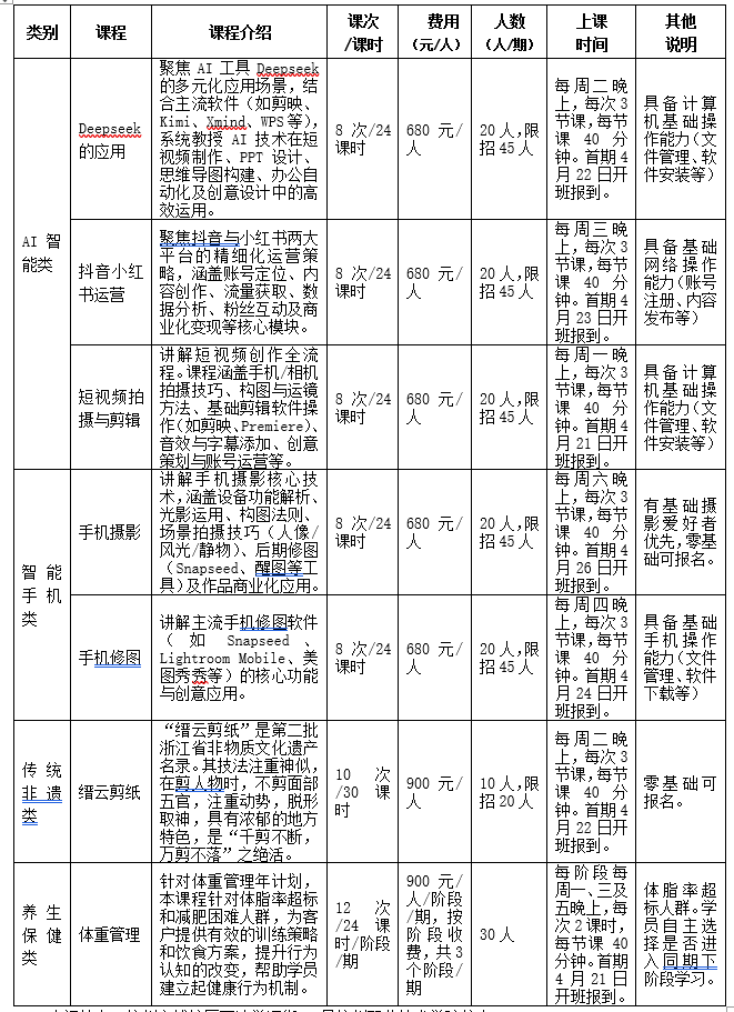 1.AI智能类:Deepseek应用、抖音小红书运营、短视频拍摄与剪辑。