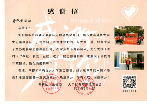 3月22日,我校收到共青团大余县委感谢信。据了解,寒假期间,信息工程学院应电2011龚纪杰在家乡新城镇樟树下村协助社区干部走访农户,调查各户房屋信息及存在的安全隐患,并将其录入系统上报政府。通过实地走访,排除每处隐患,使居民的住房安全得到基础保障,为社区组织的规范化、制度化、经常化发展增添一份力量。共青团大余县委对龚纪杰颁发感谢信,以此感谢他在假期中积极响应团县委及青年志愿者的号召,肯定他为志愿服务工作付出的努力。