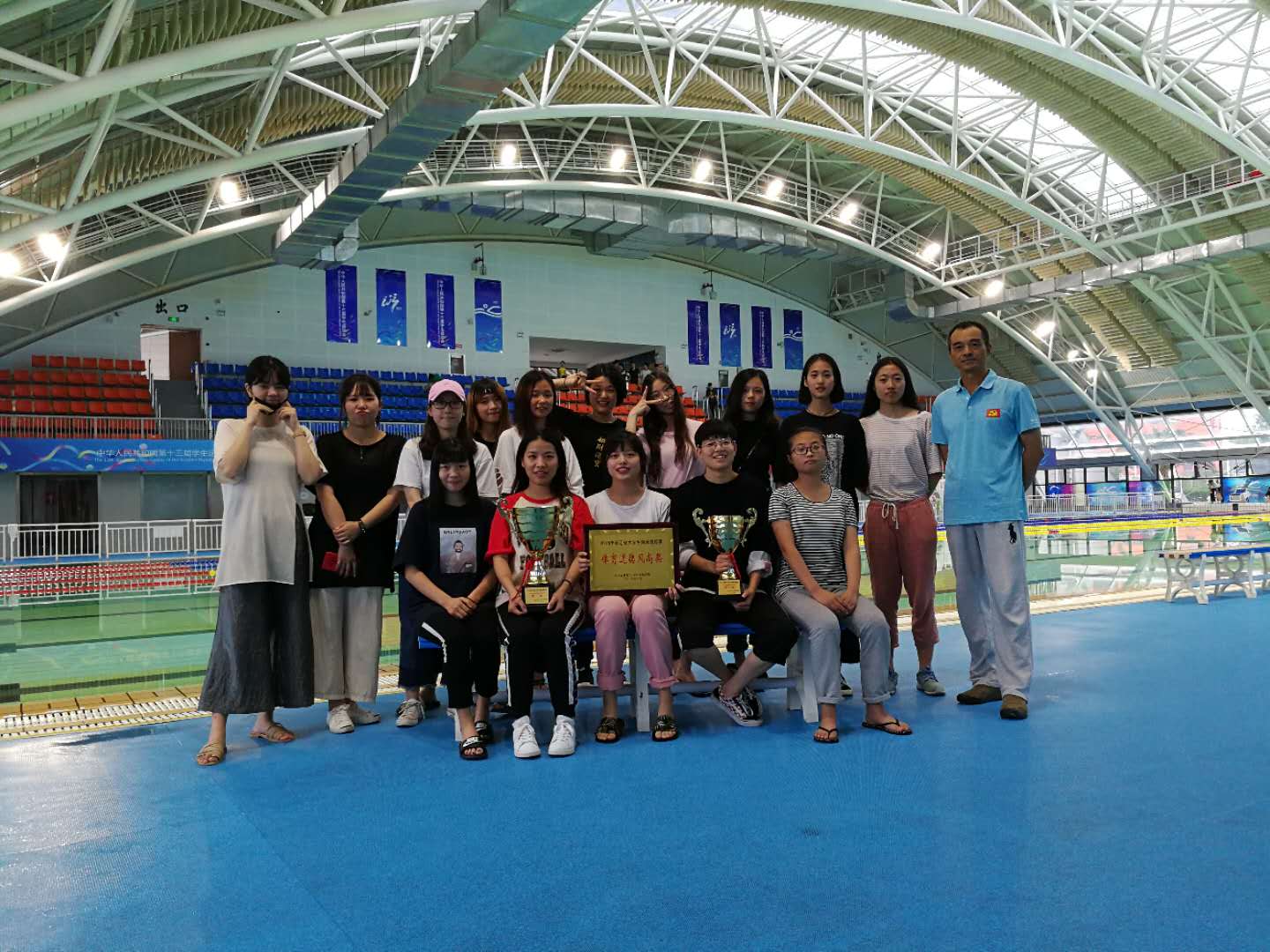 本次赛事中,我校女子游泳队以总分131分的好成绩稳获团体总分第一,每位运动员都体现了积极努力、团结友爱、拼搏向上的体育精神,获得了本次赛事的“体育道德风尚”荣誉奖,教练李曲波被评为浙江省“优秀教练员”称号。