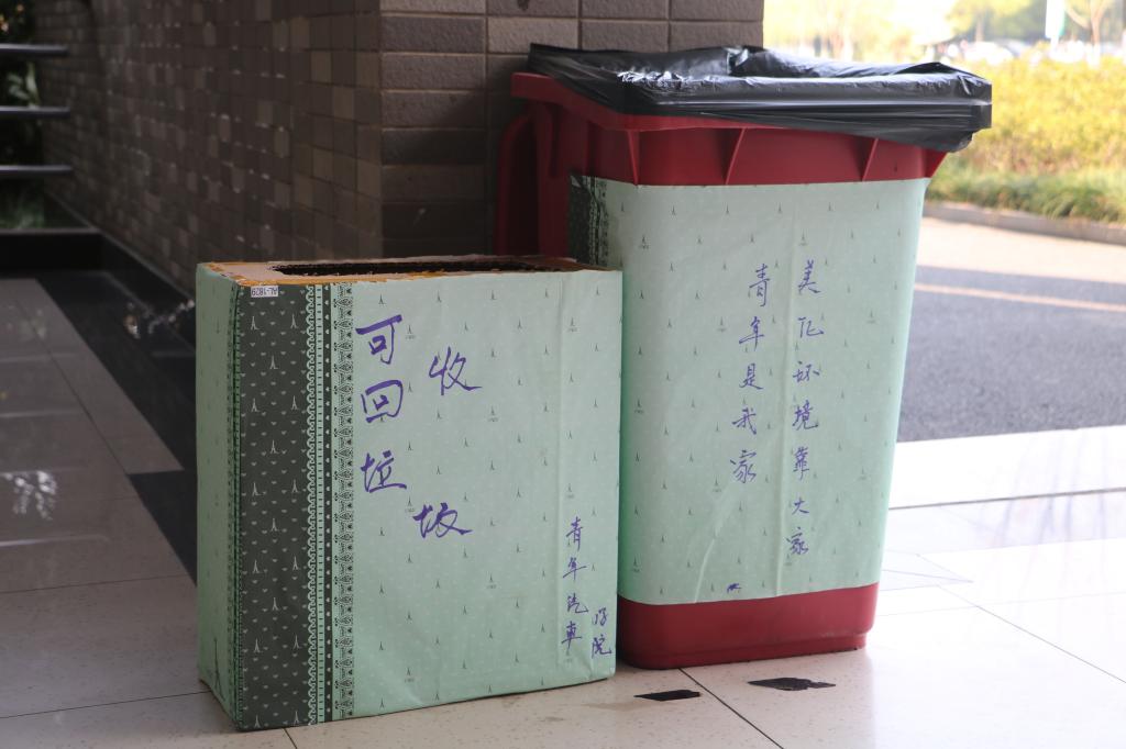 志愿者们在青年楼每一层均设置了垃圾分类点——由一套分类垃圾箱和分类指南组成。同学们将手边垃圾按类别投放至对应的垃圾箱即可,后期可回收物会专门送至资源回收站,而其他垃圾则由教学楼打扫卫生阿姨处理。